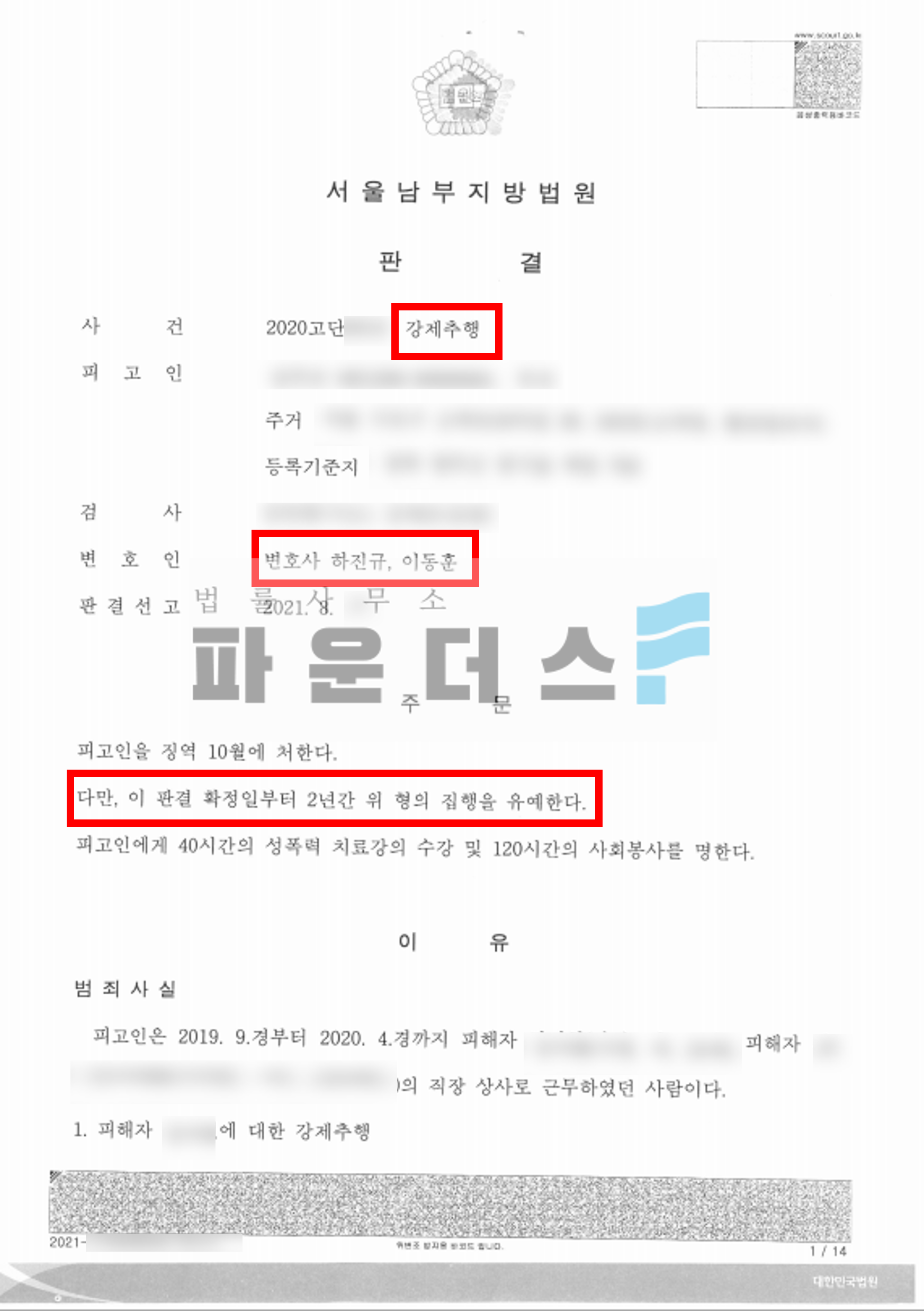 그 결과 의뢰인은 직장 내 3명의 직원을 대상으로 한 강제추행 혐의에서 집행유예의 결과를 받을 수 있게 되었습니다.