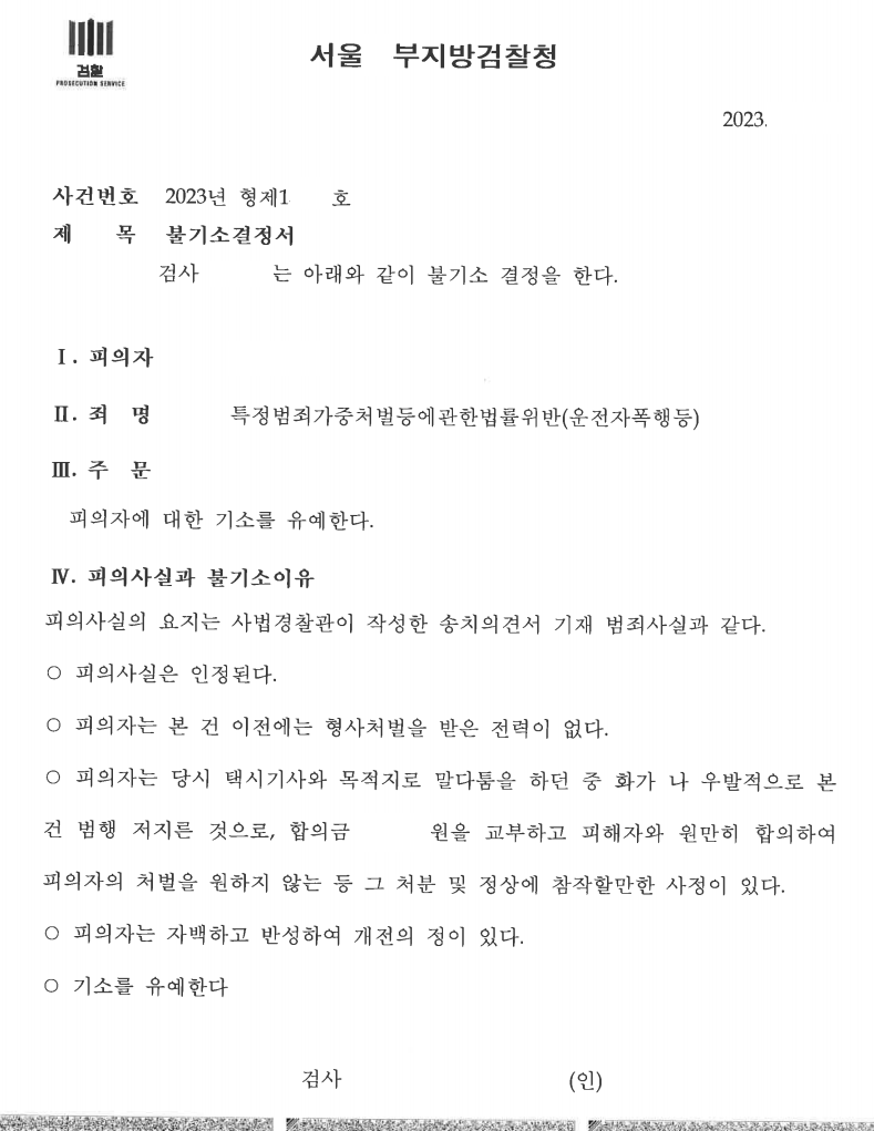 의뢰인이 택시기사를 폭행한 것은 사실이었기 때문에 최대한 빠르게 피해자와 합의를 하는 것이 필요하였습니다. 이에 손조흔 변호사는 피해자인 택시기사를 직접 만나러 가서 합의교섭을 한 끝에 통상적인 수준의 합의금을 지급하고 합의서를 받았고, 이를 수사기관에 제출하고 수사에 입회하여 의뢰인을 적극 방어하였습니다.