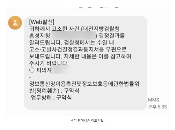 원래 경찰에서 상대 측이 작성한 '후기' 는 의견의 표현일 뿐이다라고 불송치결정을 내렸는데, 의뢰인분께서는 억울다고 하시며 저희에게 이의신청을 맡겨주셨고, 저희는 이의신청서를 작성하여 곧바로 경찰의 불송치 결정을 뒤집고 검찰의 '기소' 결정을 이끌어내었습니다.
