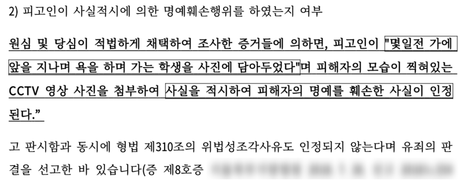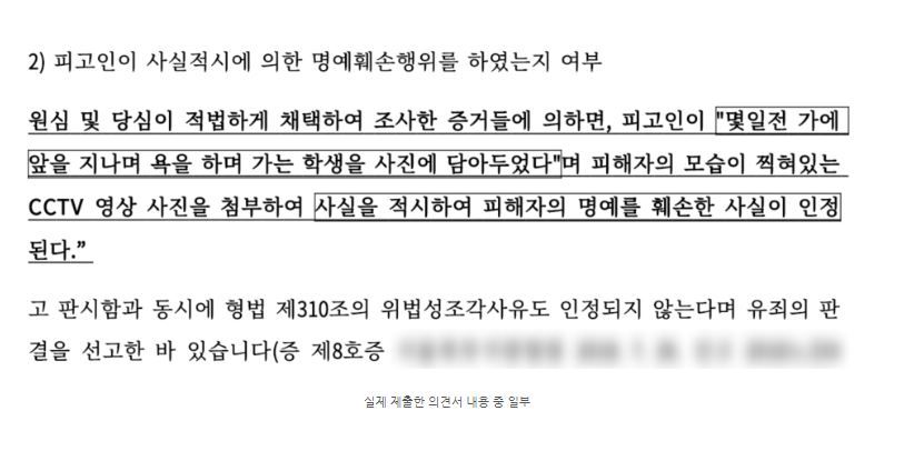 그와 더불어 실제로 하급심 판결에서 '욕설을 하였다' 에 대해 '사실의 적시' 임을 인정하여 유죄의 판결을 선고한 판례를 인용하여 저희의 주장에 설득력을 더하였습니다.