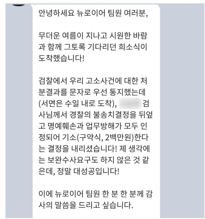 후기 명예훼손으로 인해서 고통을 받고 계신 분들이라면 저희의 성공사례 잘 참고하셔서 고소 진행하시는 데 조금이라도 도움되셨길 바라고, 혹시나 관련하여 전문적인 도움이 필요하신 분들은 언제든지 저희에게 연락주셔도 좋습니다!