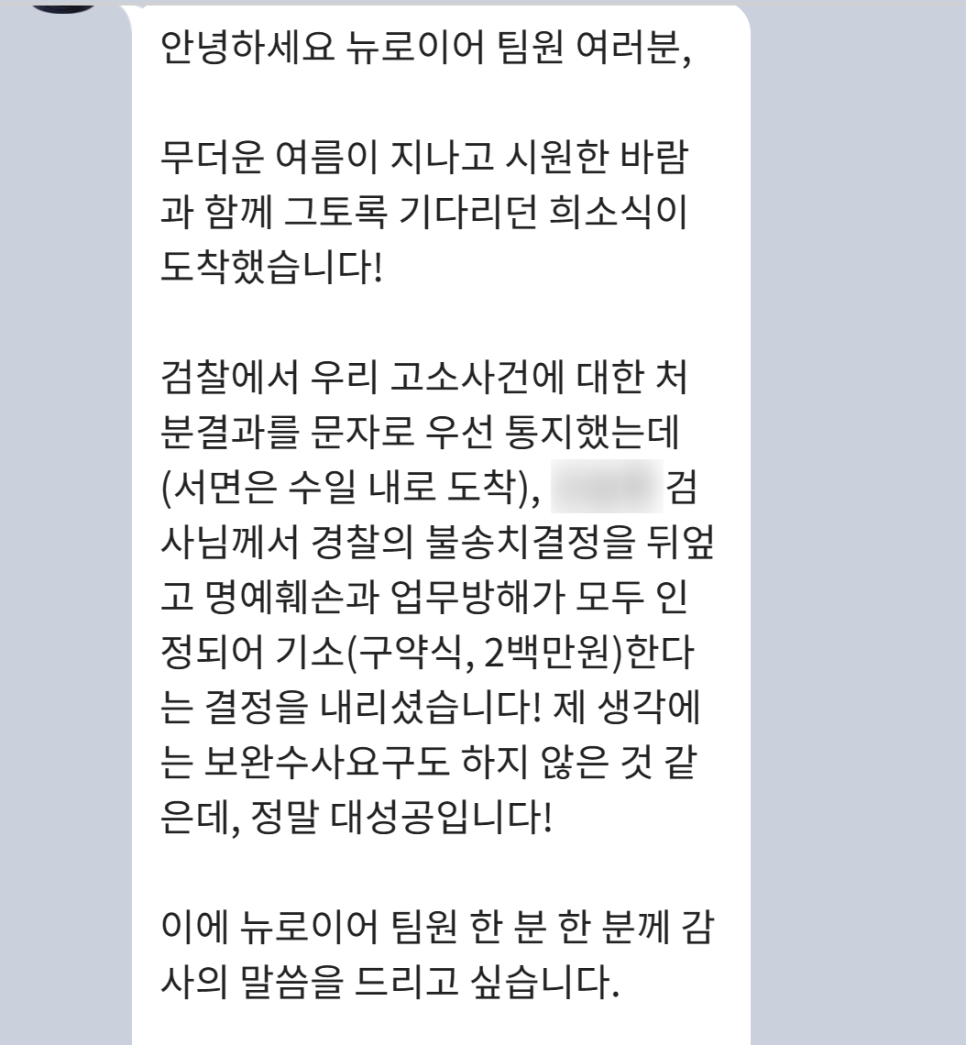 의뢰인분께서는 당연히 이의신청이 받아들여지더라도 보완수사 등 수사에 더 많은 시간이 소요될 것이라고 예상하셨는데, 그 예상보다 훨씬 빠르게 더 좋은 결과를 받으시고 너무나도 기뻐하시며 저희 구성원 전부에 감사인사를 전해주셨습니다.