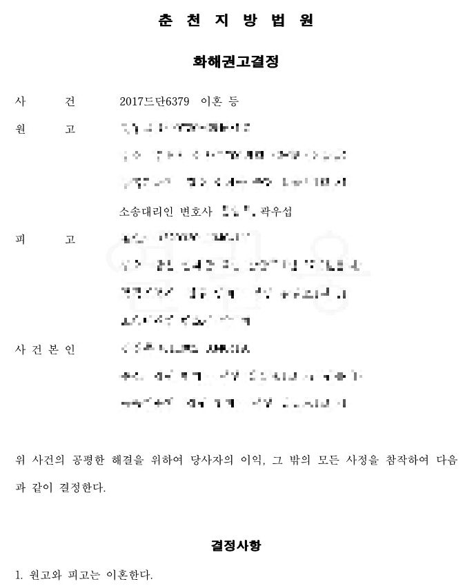 오늘은 이혼 및 재산분할과 관련하여 화해권고결정을 받아낸 사례를 소개해 드리고자 합니다.