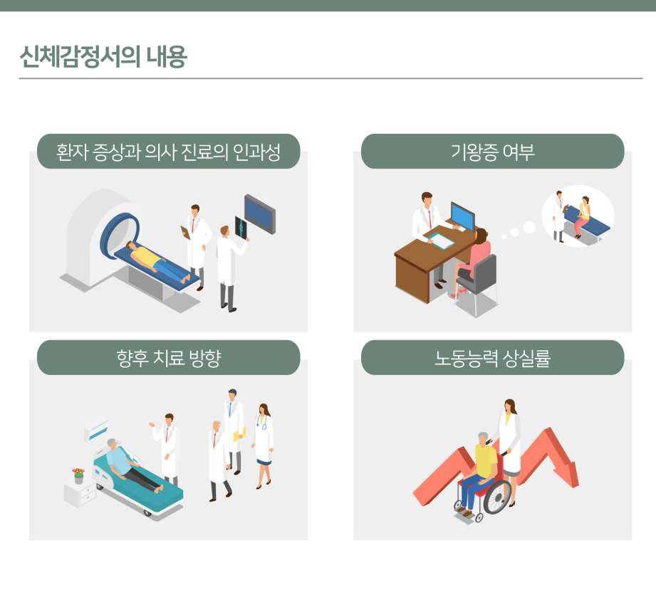 첫째로 현재 환자의 증상과 의사의 수술 · 진료의 인과성 유무입니다. 신체 감정서에서 가장 중요한 내용이지요.