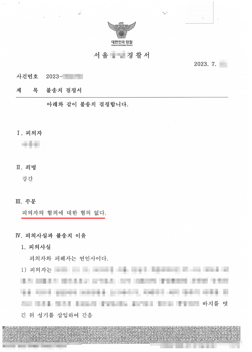 아래 사례는 송파 변호사 법무법인 여암의 정정교 변호사가 직접 강간 사건의 혐의를 받고 있던 의뢰인을 변호하여 경찰의 무혐의 불송치 결정을 이끌어낸 사안입니다.