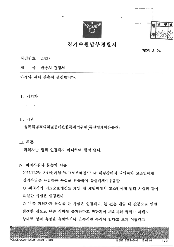 결론적으로 게임 통매음은 위 두가지 유형 모두 무혐의주장이 가능 합니다. 특히나 첫번째 성적 패드립 유형이 무혐의처분을 받기에 더욱 쉽고, 두번째 유형조차도 무혐의처분을 받는 것이 그리 어렵지 않습니다.