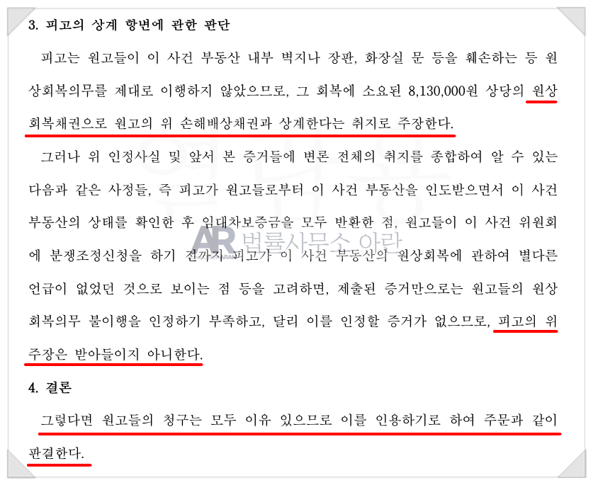뿐만아니라 분쟁조정위원회에서 주장했던 것과 마찬가지로 오히려 자신이 의뢰인으로부터 원상회복비용을 받아야 하니, 설령 의뢰인에게 손해배상해주어야 할 금액이 있다고 하더라도 원상복구 비용으로 그 손해배상액을 상계하겠다고 주장했습니다.