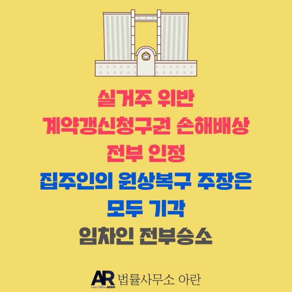 오늘은 임차인이 임대인의 실거주 위반을 지적하며 손해배상을 청구하자, 임대인이 원상회복을 주장하며 상계(공제) 항변을 하였던 사례에서, 임차인이 승소한 케이스를 살펴보겠습니다.