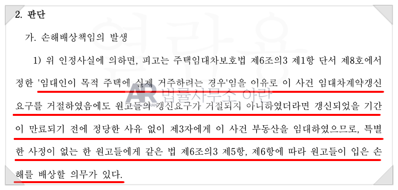 소송 과정에서 집주인은 자신이 소유한 다른 아파트의 세입자가 갑자기 이사를 나가게 되어 자신이 그 집에 들어가 살아야 할 사정이 생겼기 때문에, 이 사건 아파트를 제3자에게 임대한 것이라며 손해배상의무가 없다고 주장했습니다.