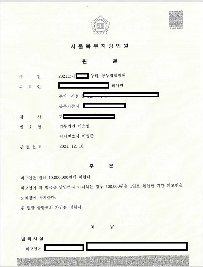 의뢰인은 술에 취해 여자친구와 다투던 중 신고를 받고 출동한 경찰의 얼굴을 박치기하여 심한 상해를 입혔습니다. 또한 이전 범죄 경력 등으로 인해 의뢰인은 실형을 걱정해야 하는 상황이었습니다. 그러나 저희의 도움으로 다행히 벌금형에 그칠 수 있었습니다. 벌금이 다소 많기는 하지만 처음에 실형을 걱정했던 사건인 만큼 다행인결과가 아닐 수 없습니다.