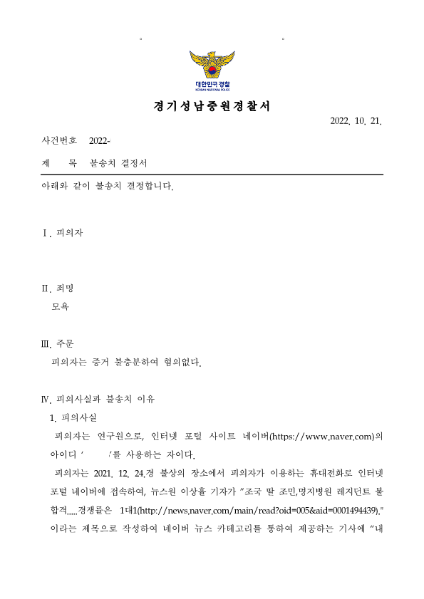 피의자는 "조국 딸 조민, 명지병원 레지던트 불합격.... 경잴률은 1:1"이라는 인터넷 기사에 댓글로,