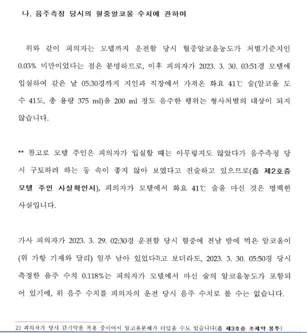 부유는 의뢰인의 진술과 객관적인 증거를 토대로 의뢰인이 전날 저녁에 마신 술의 종류와 양을 분석한 뒤 전날 마신 술에 대한 알코올은 이미 운전 당시 분해되었고, 음주 측정된 음주수치에서 모텔에서 마신 술에 해당하는 음주수치를 제외하는 방법의 위드마크공식을 적용하여 의뢰인이 다음날 새벽 02:30경 운전할 당시의 음주수치가 처벌기준인 0.03% 미만이라는 점을 변호인의견서에 담아 적극 주장하였습니다.
