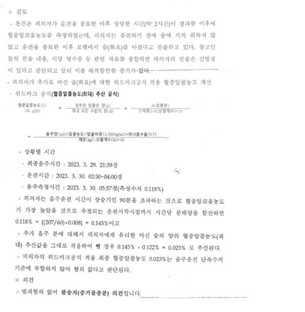 2) 위드마크 공식을 적용하여, 의뢰인이 운전 당시 처벌기준 미만의 음주수치였음을 주장하였습니다.