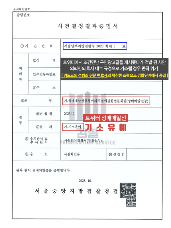 트위터에서 조건만남 구인 게시글을 올렸다가 경찰에 적발되어, 성매매 알선 혐의로 입건된 사안입니다.