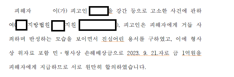 오늘은 성범죄 피해자를 대리하여 고소장을 작성하고, 범행을 부인하는 성범죄 가해자를 기소시킨 후 합의금 1억원을 받은 사례를 소개해드리려고 합니다.