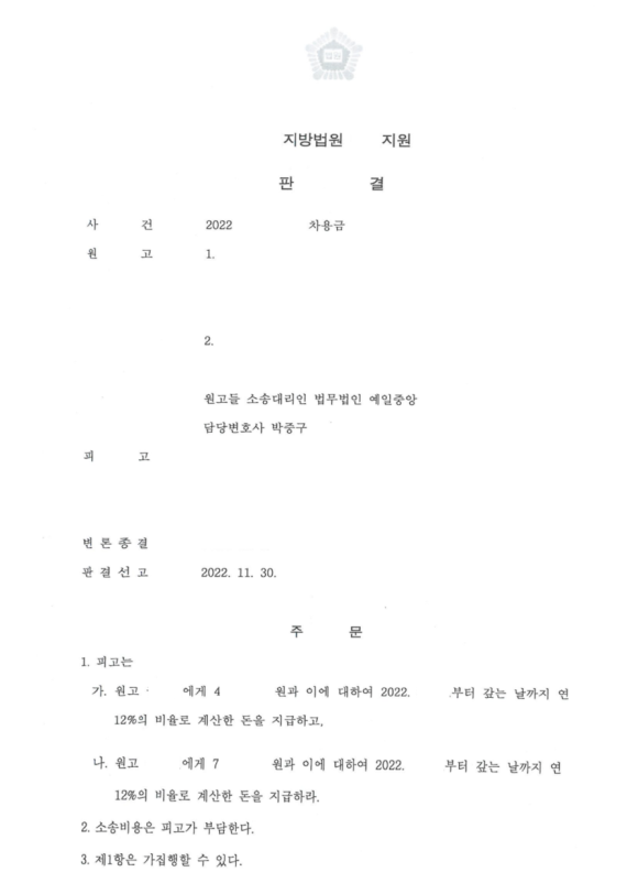 2. 저는 의뢰인을 대리하여 차용금 청구소송을 제기하고 법원으로부터 차용관계를 인정받아 승소판결을 받은 사례입니다.