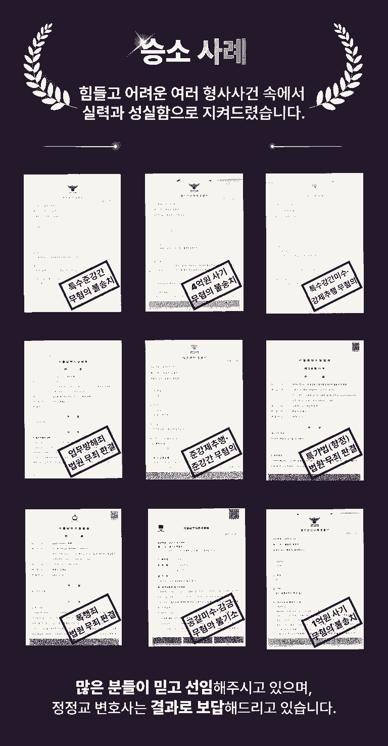 형사사건이 발생하여 수사를 받게 되는 경우 많은 분들께서 법률사무소 여암의 정정교 변호사와 상담을 받은 뒤 정정교 변호사를 선임해주시고 있으며, 정정교 변호사는 의뢰인들의 믿음에 보답하여 수많은 무혐의 처분과 무죄 판결을 이끌어내고 있습니다.