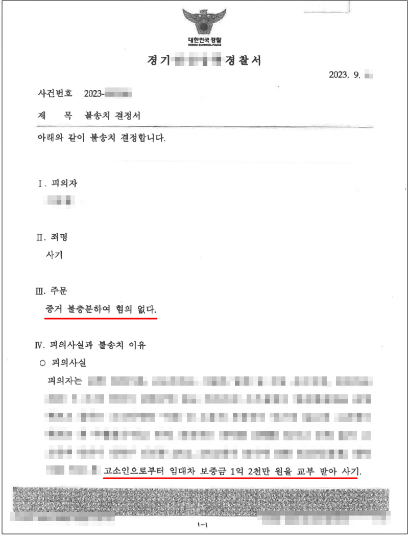 이 사건은, 피의자가 피해자에게 토지를 임대해주면서 보증금으로 1억 2,000만원을 교부받았는데, 피해자가 ‘대상 토지에 하자가 있다’라고 주장하며 피의자를 고소하여 경찰 수사가 개시된 사안입니다.