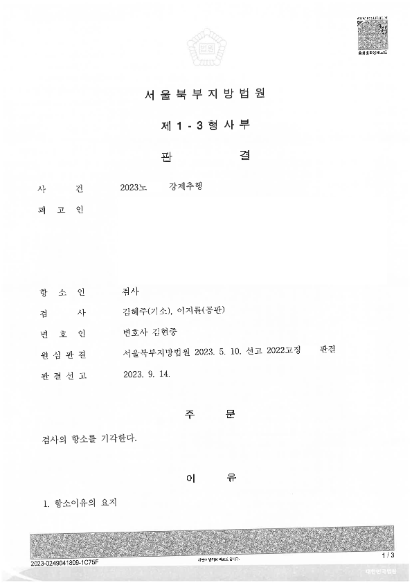 이후 검사는 1심의 무죄판결이 잘못된 판결이라면서 항소를 하였고, 2심에서 검사의 항소를 기각시키고 결국 피고인은 무죄가 확정되어 위 사건에서 누명을 벗고 자유를 되찾게 되었습니다. 이후 피고인은 무죄가 확정된 후에 형사보상청구까지 하여 자신이 입은 피해를 조금이나마 회복할 수 있었습니다.