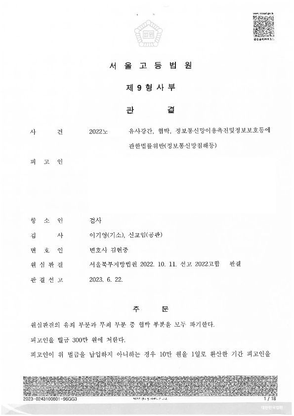 검사는 항소하였으나 마찬가지로 유사강간에 대하여는 2심에서도 무죄로 판단 되었고, 2심의 무죄판결은 검사의 상고 없이 그대로 확정 되었습니다. (피고인은 성관계 영상 파일을 유포하겠다는 협박 혐의에 대하여만 벌금 300만원을 선고받게 되었습니다.)