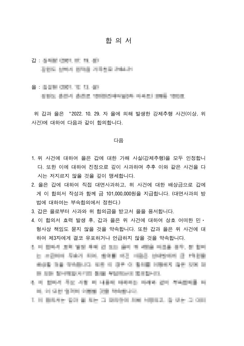 사과하고 합의금 1억원을 지급하는 것으로 양측이 모두 만족할 만한 합의를 이끌어냈습니다.
