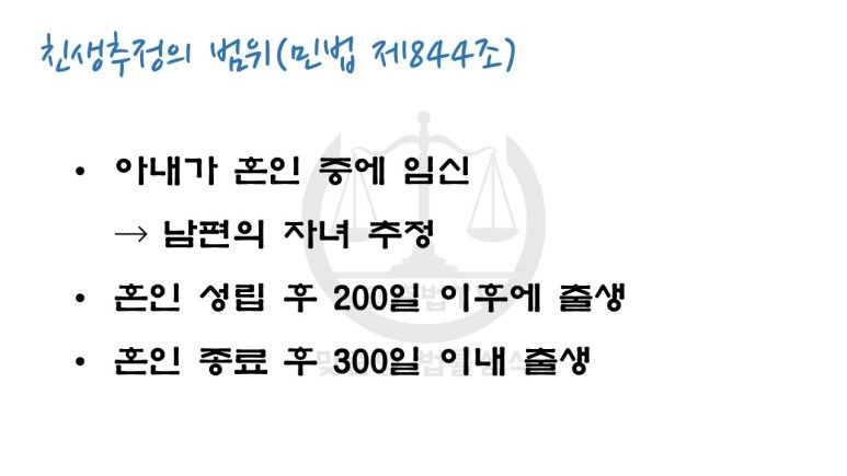 친생추정의 개념에 이어, 이 추정이 미치는 범위를 설명드립니다. 사실 친생추정이 왜 있는지 무슨 의미가 있는지 그 자체보다는 친생추정의 범위가 더 중요합니다.
