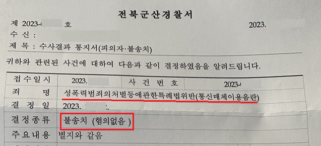 본 변호인의 조력 결과 결국 경찰은 의뢰인에게 통매음 혐의가 인정되지 않는다며 불송치(혐의없음) 처분을 하였습니다.