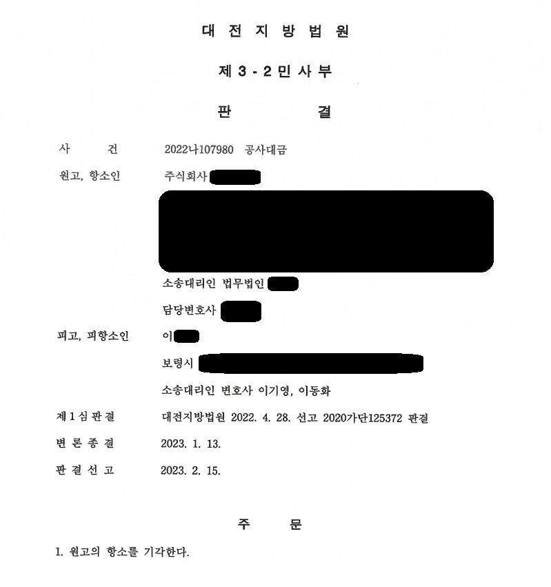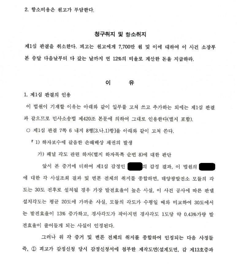 [사안] 1심에서 본 변호사에 의해, 태양광발전소 공사업체의 의뢰인에 대한 공사대금 지급 청구가 기각된 사건의 항소심임. 공사업체는 1심에서 인정된 태양광패널각도에 대한 하자보수금액이 잘못되었다면서 1심 판결을 취소해달라고 주장하였으나, 다른 하자도 다수 존재하는 점, 이외에도 공사업체가 계약상 의무를 이행하지 않은 점 등을 주장, 입증하여 공사업체의 항소심 청구 또한 기각시킨 사례.