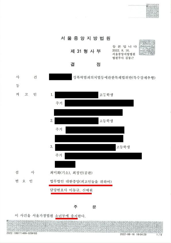 법원은 이동규 변호사의 주장을 받아들이고 A군을 소년부에 송치하는 결정을 내렸습니다.