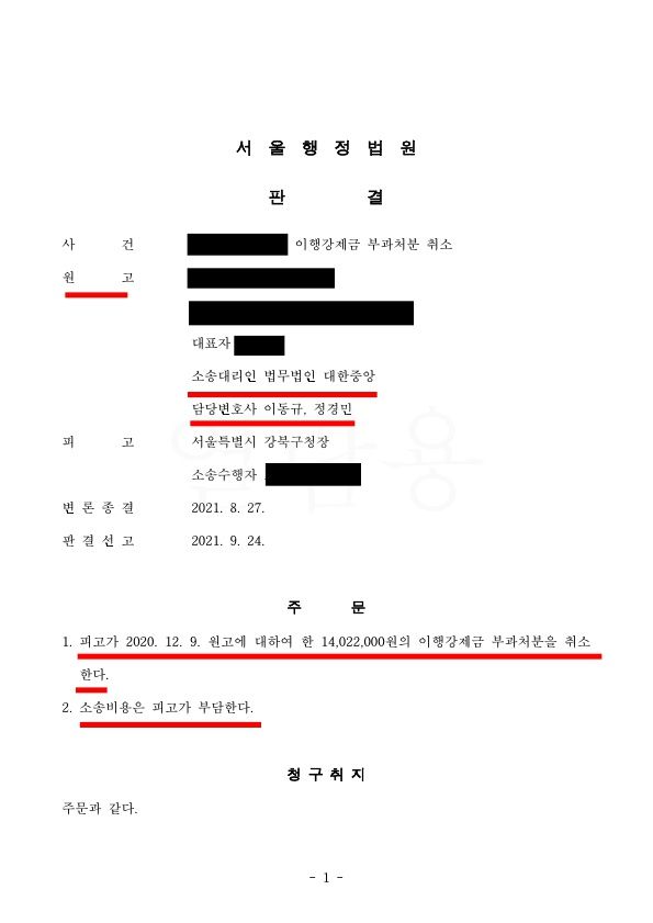 법원은 처분사유가 없다는 이동규 변호사의 주장을 모두 받아들여 이행가제금 부과처분을 취소하라고 주문했습니다.