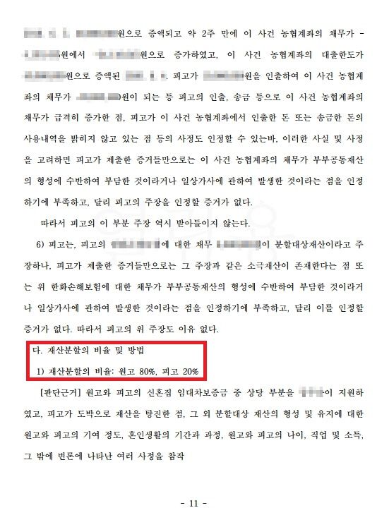 변호인의 주장이 받아들여져서 혼인기간이 10년임에도 의뢰인의 기여도가 80% 인정되었습니다.