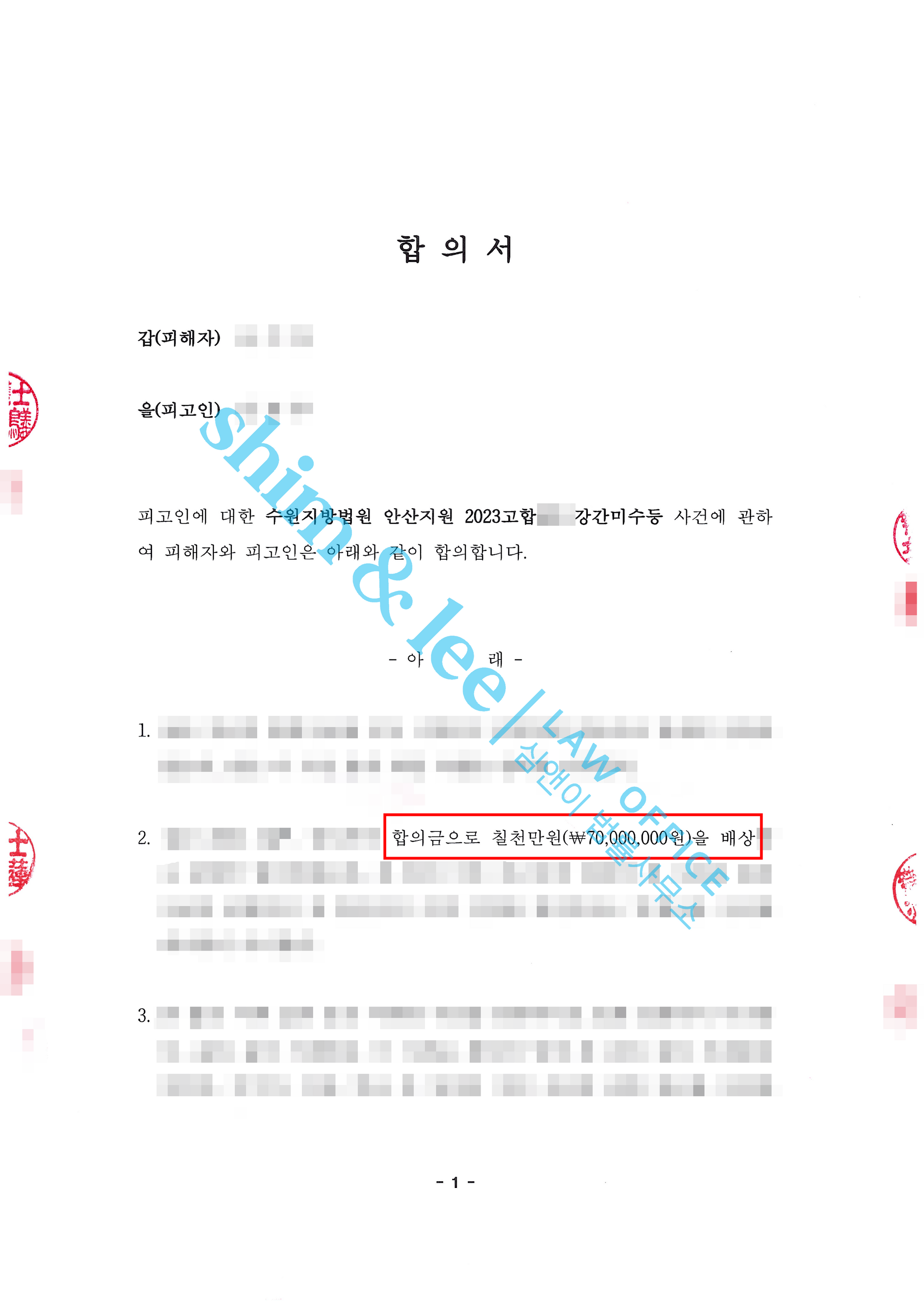 심지연 대표변호사님이 합의금 협상을 직접 진행했고, 거의 2개월 동안 이어진 기나긴 협상 끝에 가해자측 제안액 2천만 원에서 최종 7천만 원까지 합의금을 상향시켰습니다.