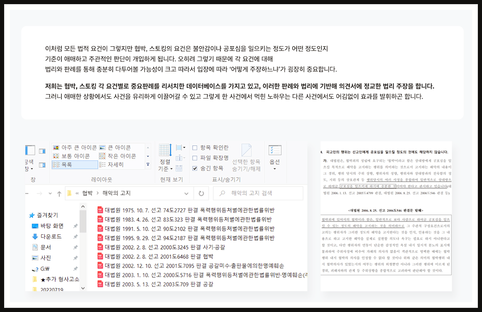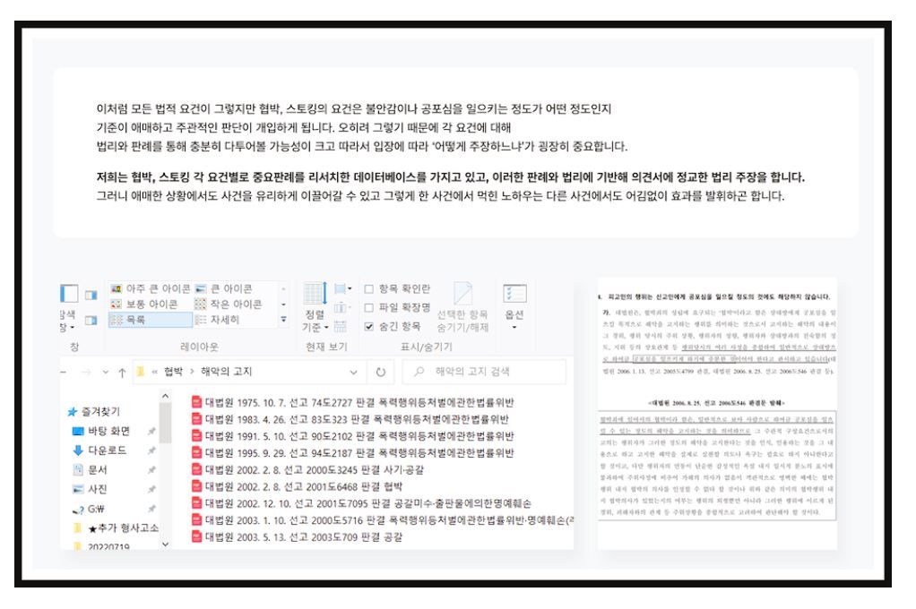 스토킹변호사를 알아보신다면 여러분 스스로 '어떤 조력자를 찾아야 하는지' 그 감을 얻으실 수 있을 거라 생각합니다.
