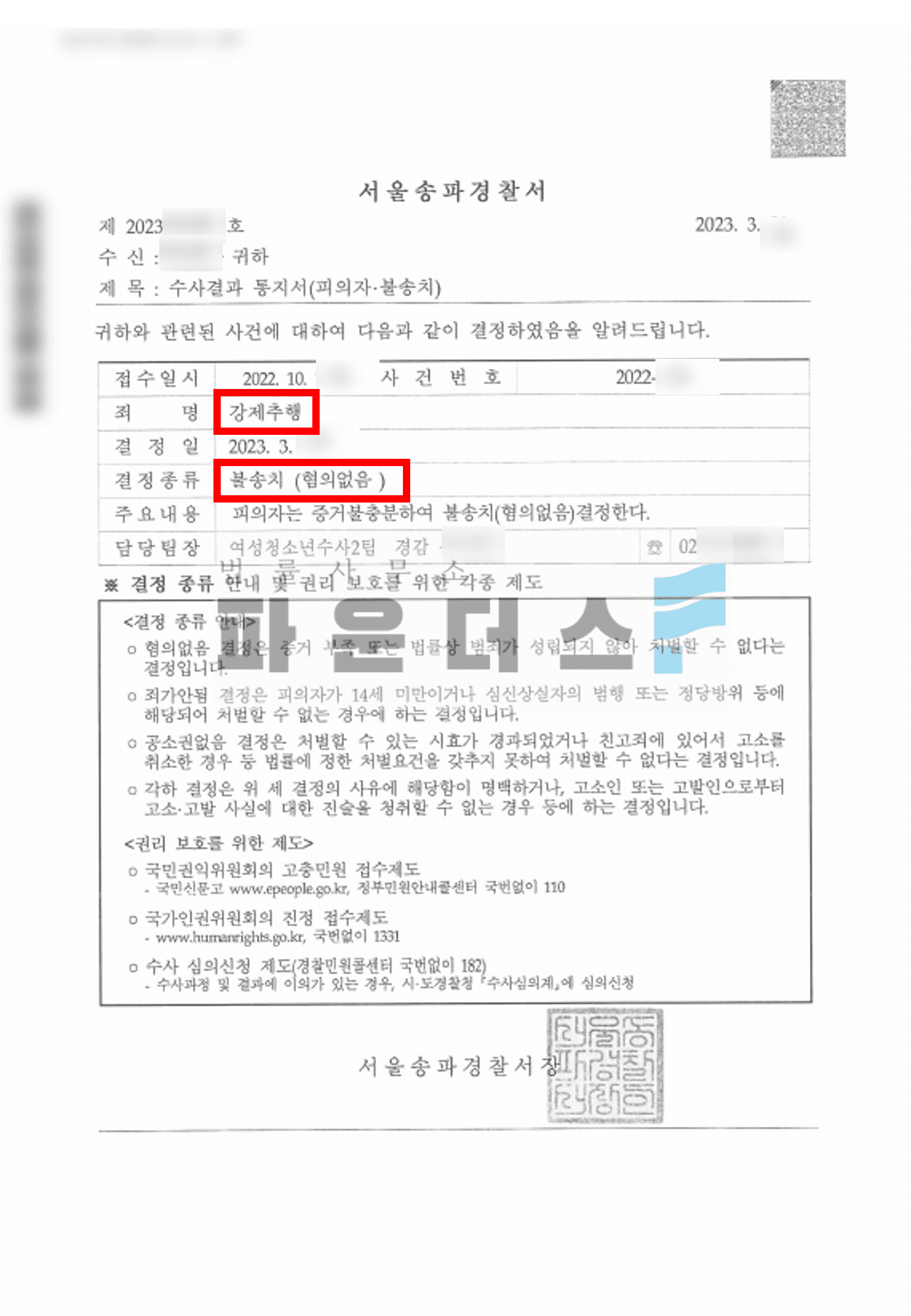 그 결과 의뢰인은 강제추행 혐의에 있어 불송치 결정으로 사건을 마무리 지을 수 있었습니다.
