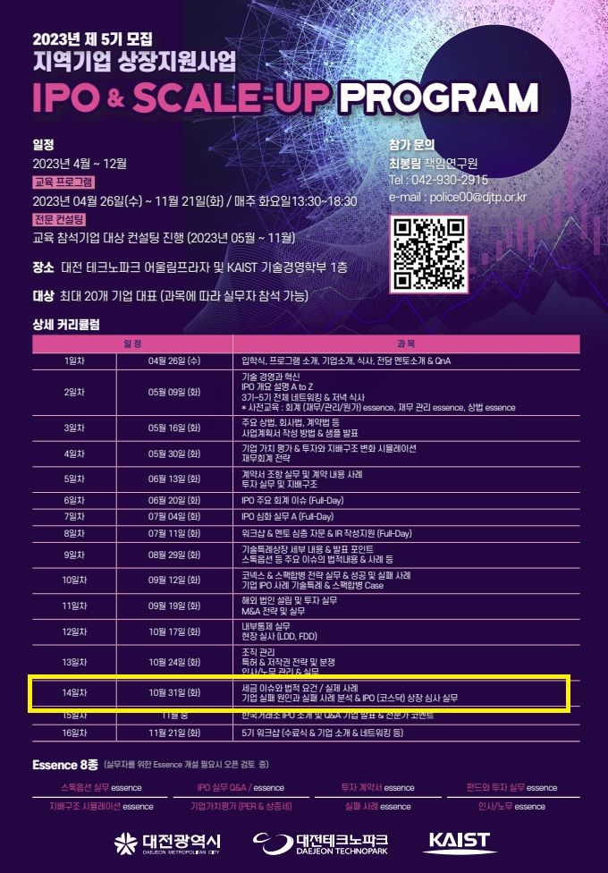 최지현 변호사는 2023. 10. 31. 한국과학기술원(KAIST)와 대전광역시가 주최하는 지역기업 상장지원사업(IPO&SCALE-UP PROGRAM)에 강사로 초빙되어, "IPO(코스닥) 상장 심사 실무"와 함께 1) 투자계약 체결 시 필수적 Check-point와 2) 상장 전 반드시 확인하여야 하는 기업의 법률 이슈 등과 관련하여 강의하였습니다.