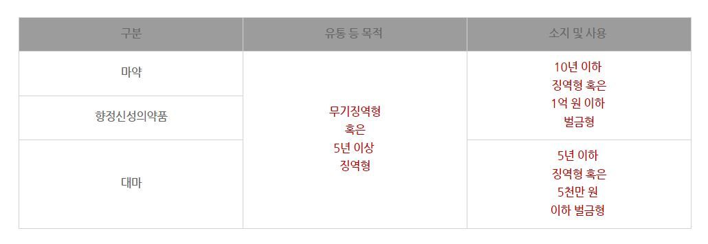 마약 처벌 수위를 정리해 드린 표입니다.