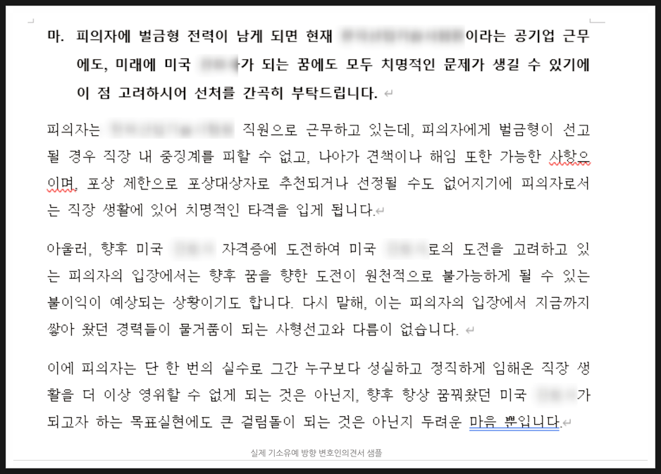 저희가 확인 후 피드백을 진행하며 검사의 마음을 살 수 있도록 일부 수정하여 선처를 구하고 있습니다.