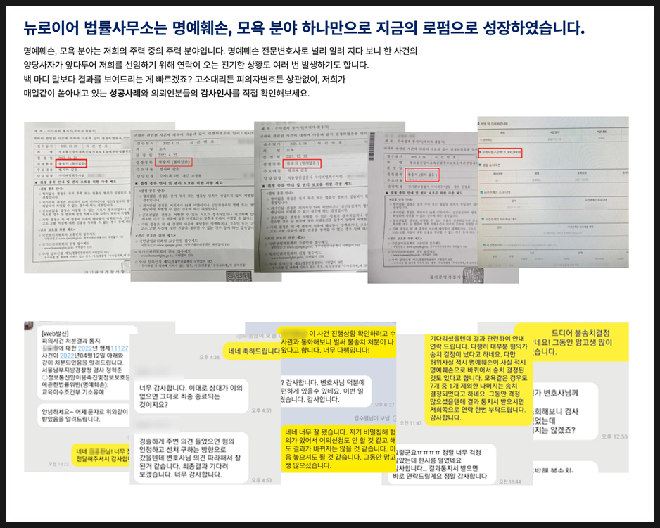 아무래도 저희가 명예훼손 사건을 특화하며 서울대/고려대/성균관대 출신 변호사 상담부터 1:1 전담 마크를 하고 있다 보니,