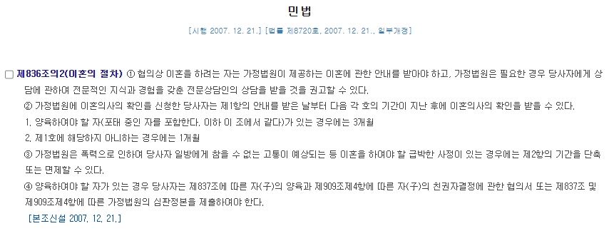 위와 같이 기존 협의이혼 제도를 수정하여 2007. 12. 21. 민법 제836조의 2가 신설되었고 2008. 6. 22.부터 협의이혼에 있어서 이혼숙려제도가 시행되었던 것입니다. 이혼숙려제도란 부부가 가정법원에 협의 이혼의 의사확인을 신청할 경우 일정한 숙려 기간이 지나야 협의이혼의사를 확인하는 제도를 말합니다. 쉽게 말해 최종적으로 협의이혼이 되기 전에 부부가 이혼에 관하여 다시 심사숙고 한 후에 그래도 이혼을 하여야 할지를 결정하라는 취지인 것입니다.