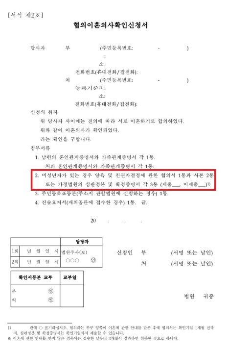 부부에게 미성년인 자녀가 있는 경우에는 협의이혼의사확인신청서 제출시 자의 양육 및 친권자결정에 관한 협의서 또는 관련 자료도 반드시 제출하여야 할 것입니다.