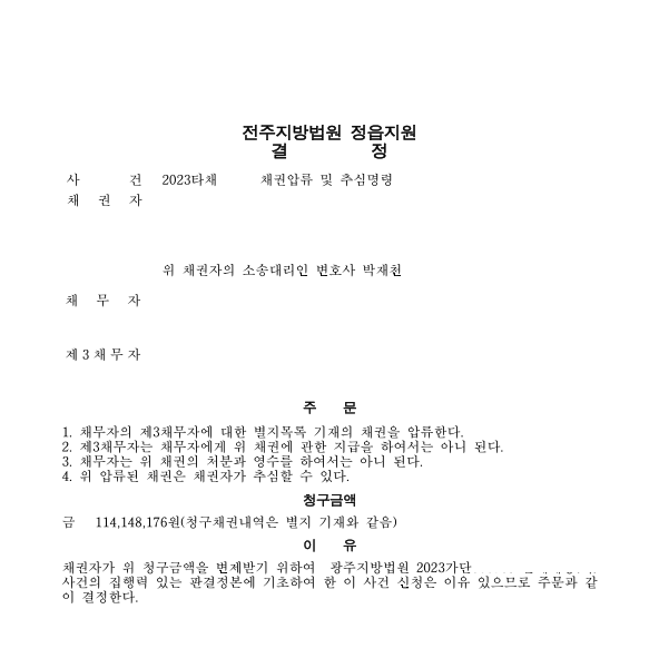 다만 건설회사가 출자증권에 대한 압류, 추심결정을 받을 경우 진행하는 사업에 타격이 있게 됩니다. 수주를 하는데도 어려움을 겪게 되는 등 자신이 영위하는 사업에 많은 문제가 발생하기 때문입니다. 건설회사가 정상적인 사업을 영위하는 회사일 경우 출자증권에 기한 반환청구권에 대하여 압류, 추심결정을 받아 현실적인 압박을 가하는 것을 생각해 볼 수 있습니다. 본 사안은 회사에 대한 채권을 가진 근로자들을 대리하여 공제조합에 압류, 추심결정을 받은 상황이며 추후 가능하다면 출자증권에 대한 법원의 압류명령을 받아서 현금화절차까지 시도해볼 계획입니다.