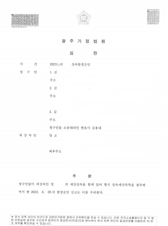 이에 본 법률사무소는 A, B, C를 대리하여 광주가정법원에 특별한정승인 수리 신청을 하여 결국 특별한정 승인 수리 결정을 받았고, 그 후 위와 같은 특별한정승이 수리 결정을 기반으로 양수금 청구소송에 대응하여 결국 A, B, C는 상속받은 재산의 범위 내에서만 채무를 갚으라는 화해권고결정을 받을 수 있었습니다.