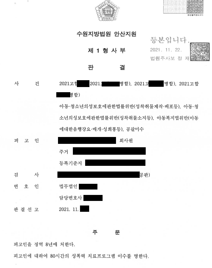 의뢰인과 피해아동이 해당 사건에 심리적으로 함몰되어 자책하지 않도록 적절한 가이드라인을 세워 케어하며 사건을 진행하였으며, 착취한 피해아동의 사진 및 영상물이 외부로 유포되지 않도록 사건을 빠르게 진행시켜 수사 단계에서 가해자가 기타 증거를 인멸하지 못하도록 조력하였습니다.