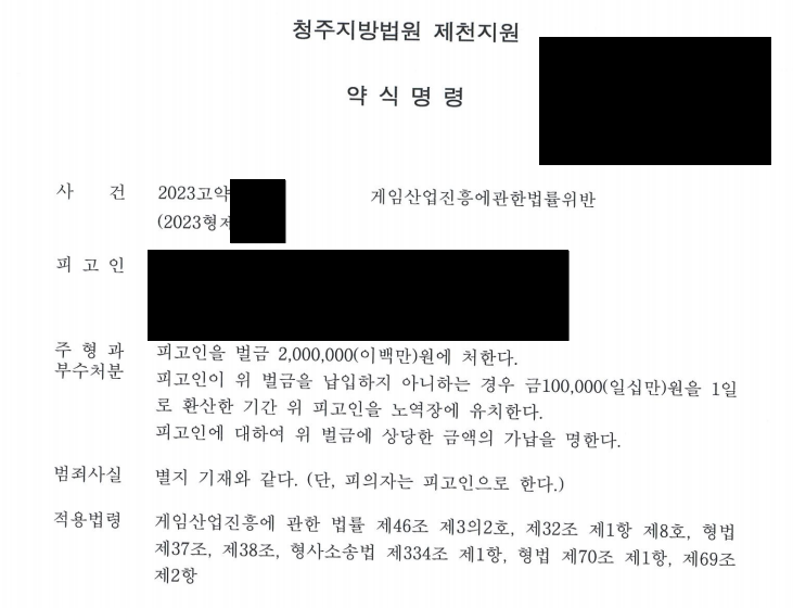 수사기관은 의뢰인에 대하여 구약식을 청구하였고, 법원의 결정을 통해 벌금형이 확정되었습니다. 게임산업진흥법위반의 경우 그 죄 자체도 문제이지만 상습적이거나 범죄수익이 큰 경우에는 그에 관한 추징도 따라올 수 있는 것이므로 이 사건과 같이 적절한 대응을 위하여는 관련 경험이 풍부한 변호인과 함께 사건에 대응하는 것이 보다 나은 결과를 얻기 위한 첫 단계라고 하겠습니다.