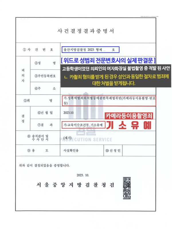 고등학생인 의뢰인이 여자화장실을 불법촬영하다가 적발된 사안입니다