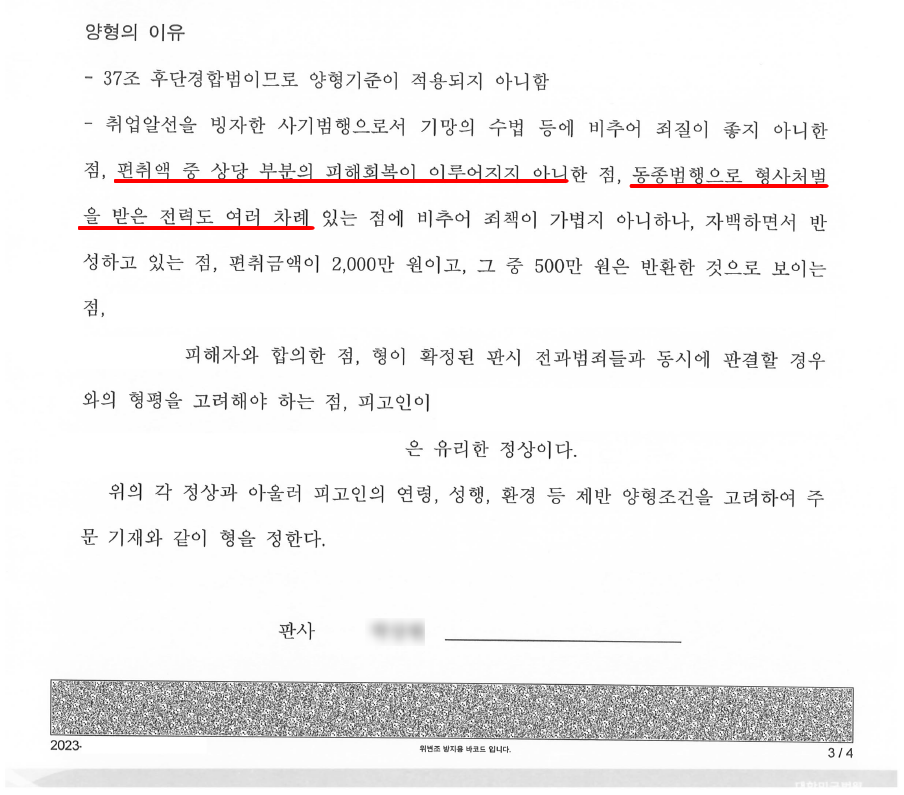 요약 : 과거 동종범죄(사기)로 집행유예 1회, 실형(징역형) 2회 전과 有, 누범기간, 피해회복 실패 → 징역6월, 집행유예2년 선처