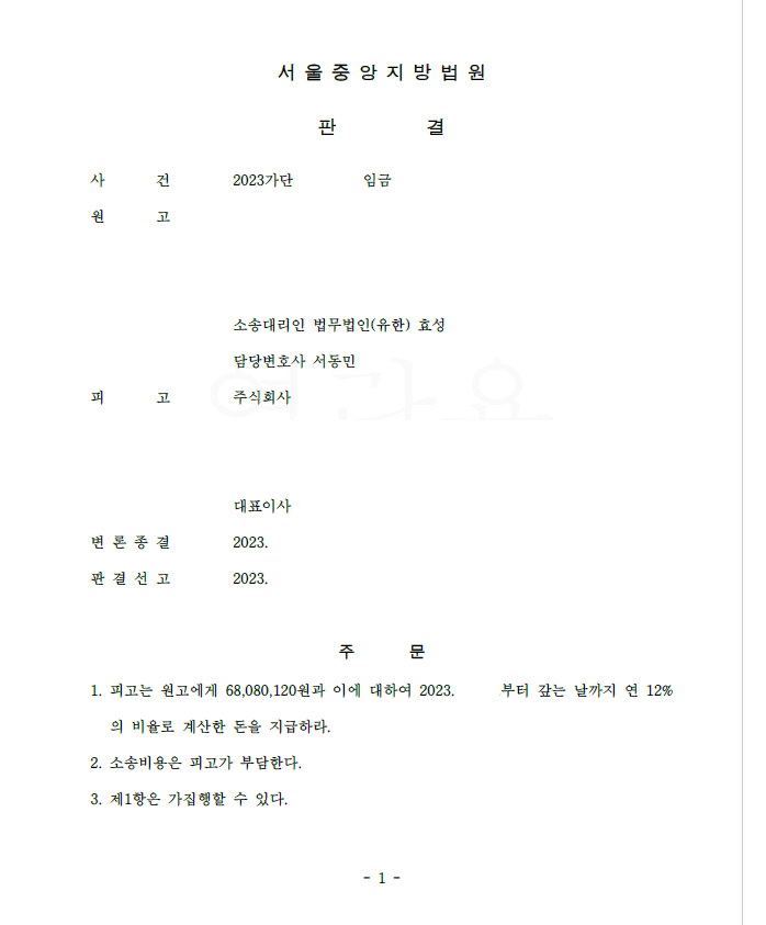 저는 즉각 임금지급 등 청구의 소를 제기하였고 법원은 원고 승소 판결을 선고하여 의뢰인은 체불임금 등을 지급받았습니다.