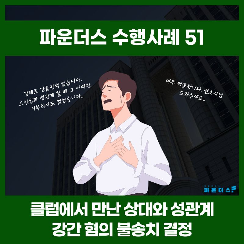 클럽 내에서 만난 여성과 원나잇에 이른 뒤 상대 여성이 의뢰인을 강간죄로 고소하게 되었으며 갑작스러운 상황에 놀란 의뢰인은 파운더스의 조력을 요청하였습니다. 의뢰인이 연루된 강간죄의 경우 성범죄 중에서도 엄벌에 처하는 사안에 해당하는 것으로 조속한 해결이 필요한 상황이었습니다.