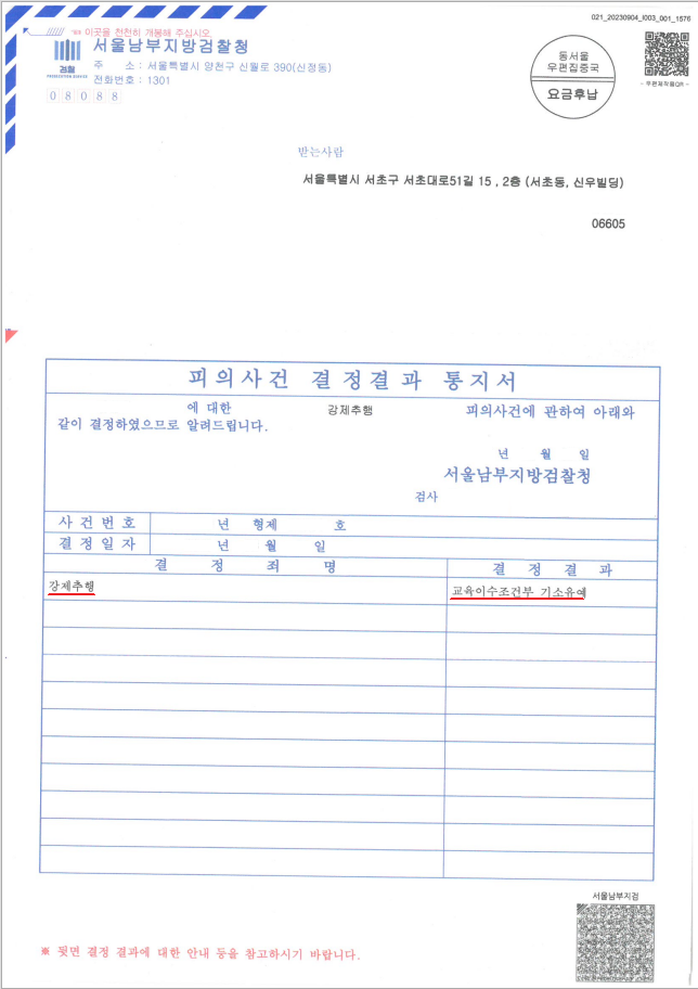 ※ 이에 서울남부지방검찰청은 "기소유예" 처분을 하여 의뢰인님께서는 아무런 전과기록도 남지 않은 사건입니다.