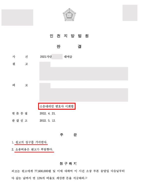 재판부는 원고의 청구가 불명확하거나 충분히 구체화되지 못하였다고 판단하였으며, 원고가 제출한 증거만으로는 송금한 금원의 성격이 대여금이라 인정하기 힘들고, 오히려 투자금이라는 피고의 주장이 설득력이 있으며 원고의 청구를 투자금에 대한 반환 청구라고 선해하여 보아도 원고와 피고가 투자금 원금을 반환하기로 약정하였거나 정산 합의가 있다고 보기 어렵다며 의뢰인(피고)의 손을 들어 주었습니다. 원고의 소송 제기 1년 만에 원고의 청구가 모두 기각되면서 전부 승소하여 피고였던 의뢰인에게 좋은 결과를 이루어 낼 수 있었습니다.